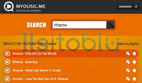 Myoumusic.me è disponibile in due versioni, una desktop e l’altra mobile. Per accedere alla versione standard e ascoltare la musica sul computer è sufficiente visitare la pagina Myoumusic.me Play. Vi troverete così dinanzi ad un motore di ricerca; inserite in nome di una canzone o artista e procedete con la riproduzione dei brani selezionando l’apposita icona. Ricordo che per poter utilizzare la versione desktop è necessario avere un browser con il supporto all’HTML5.